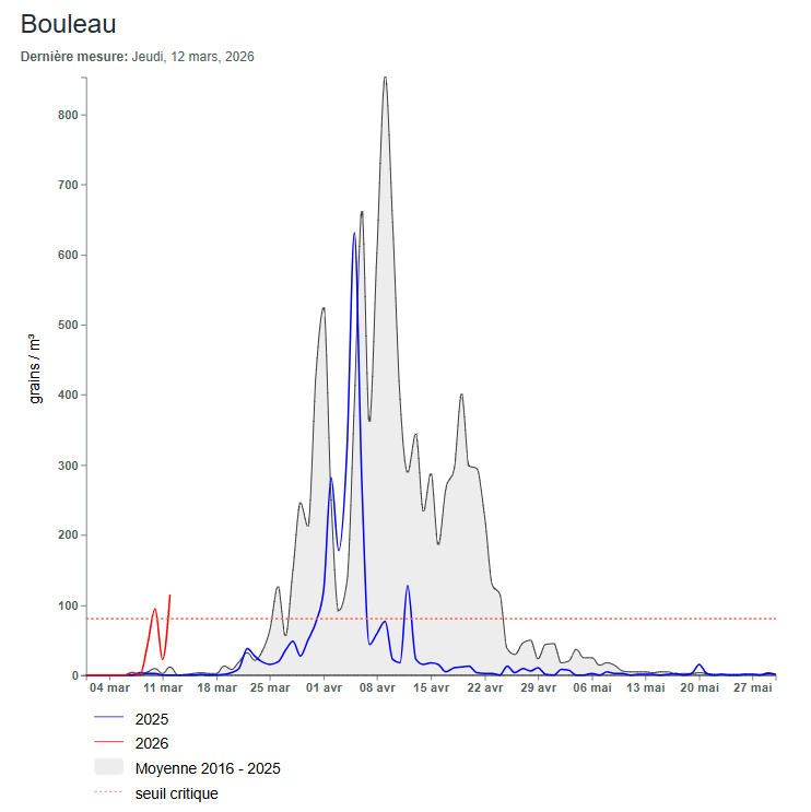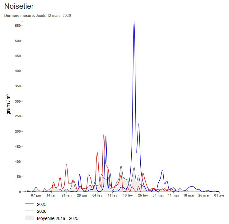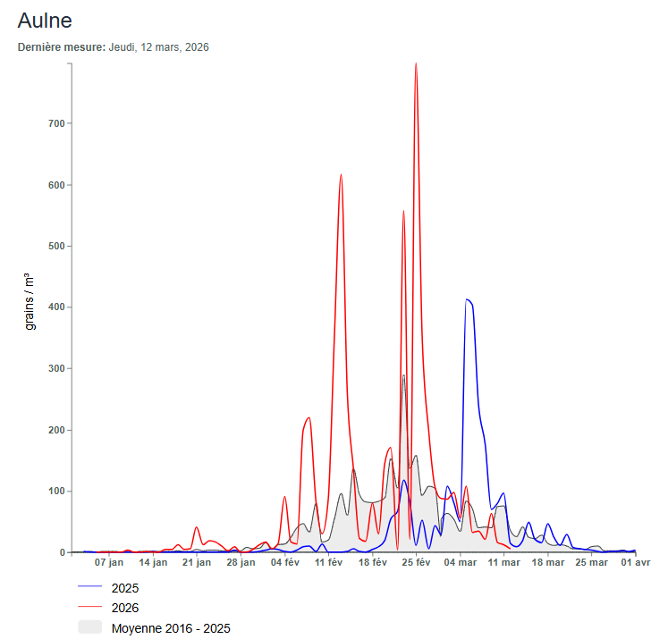 Les graphiques d’AirAllergy montrent que les pollens de noisetier et d’aulne ont atteint leur pic en février et diminuent progressivement en mars. Ils restent présents, mais leur intensité baisse.